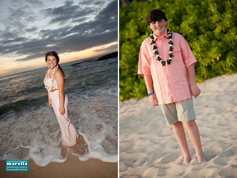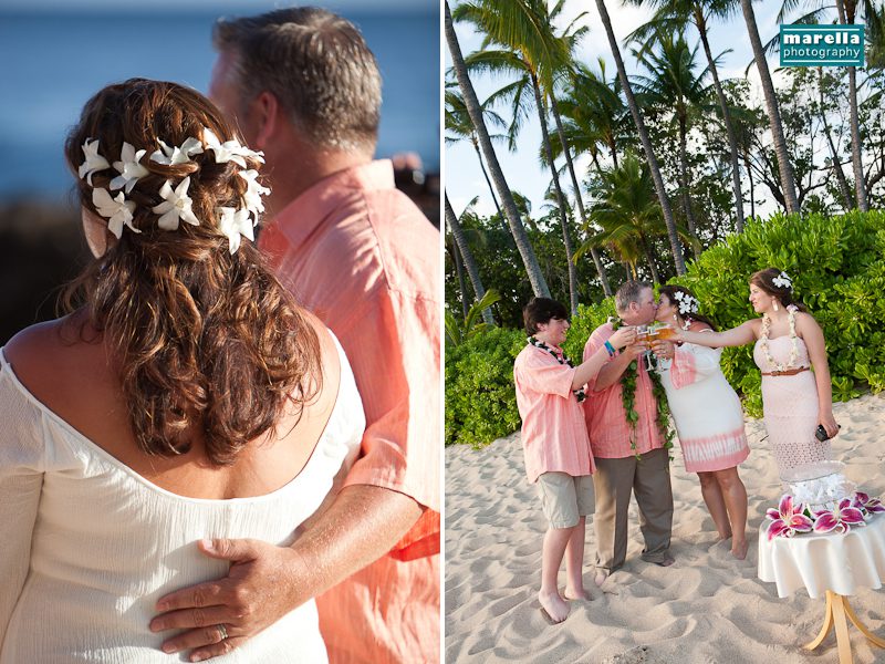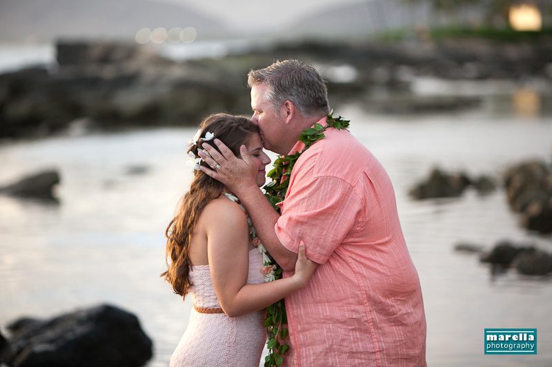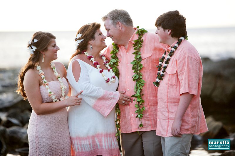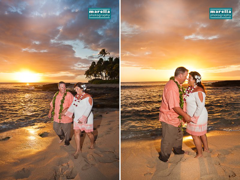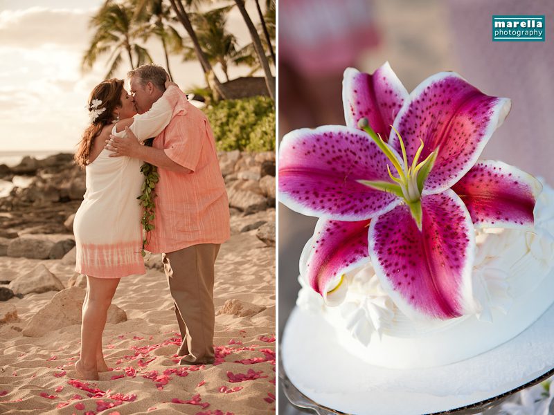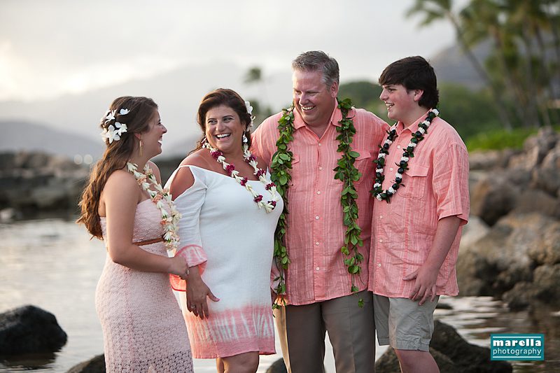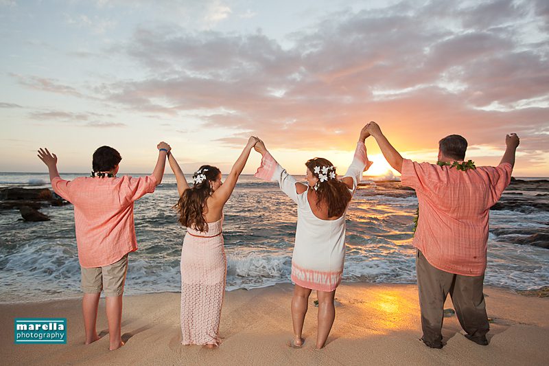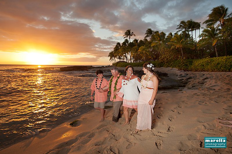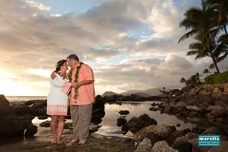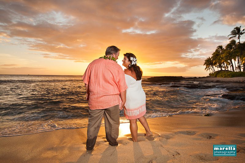 Aulani wedding photographer, Marella Photography shares vow renewal photography at Ko Olina. This was actually a surprise wedding vow renewal disguised as a Hawaii family photography session. Not too far from Disney’s Aulani Resort lies Secret Beach. A gorgeous cove that is nestled between Lanikuhonua wedding venue and the Four Seasons Resort in Ko Olina. It’s an ideal location to celebrate a special wedding anniversary. There were so many sweet details, with a Hawaiian lei exchange, their children reading sweet messages of love, a heartfelt re-commitment of their vows, wedding cake and a beautiful toast on the beach. This day turned out to be one of those magical sunsets that envelops you in a warm glow of fireworks. A perfect ending to a new beginning.