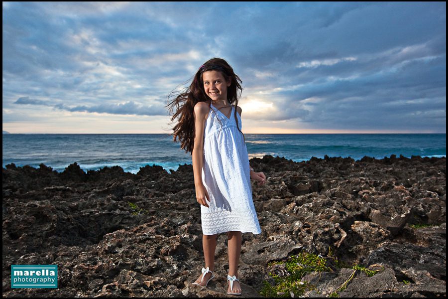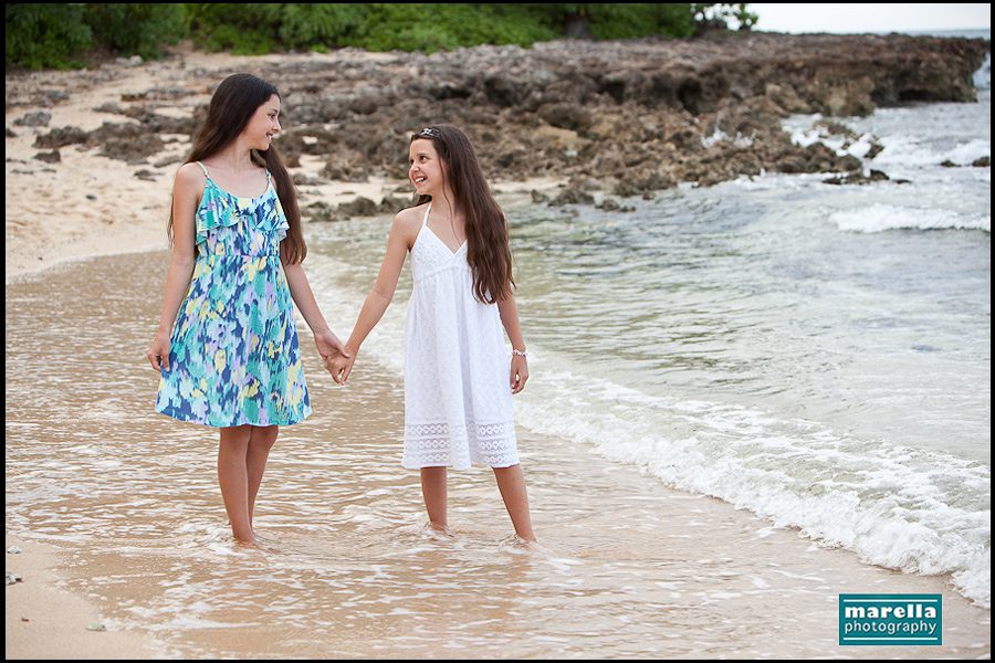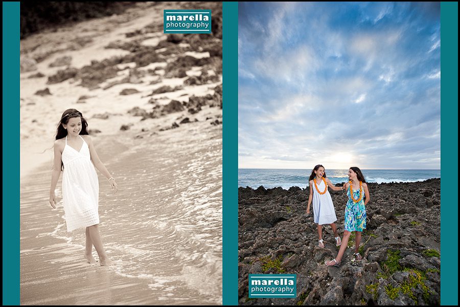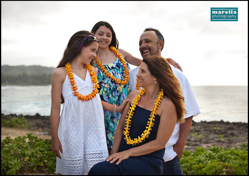 While I was photographing another family session at the Turtle Bay Resort on the north shore of Oahu. I met the Robles Family on vacation from Pasadena, California. I loved their spontaneity, as they called me the next day to book a session that week. They really wanted to get some photographs of their gorgeous daughters who have already booked some impressive jobs for modeling. We captured so many fun moments and luckily the sunset colors popped out from behind the clouds in the end . They came prepared with beautiful puakenikeni leis from North Shore Weddings and Flowers. Thanks for contacting me! I really enjoyed our time together. Here are some highlights from the day.